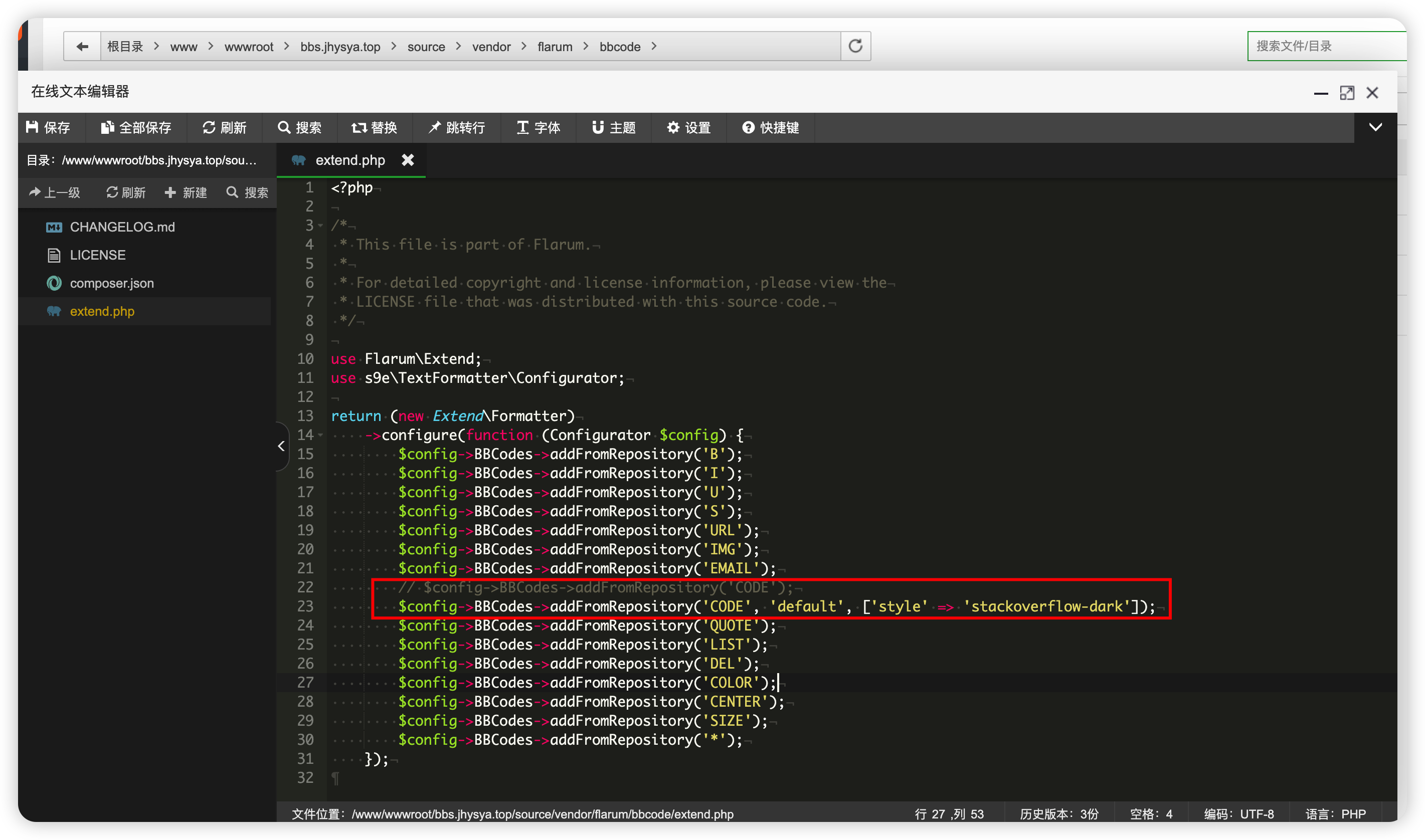 $config->BBCodes->addFromRepository('CODE');将其修改为