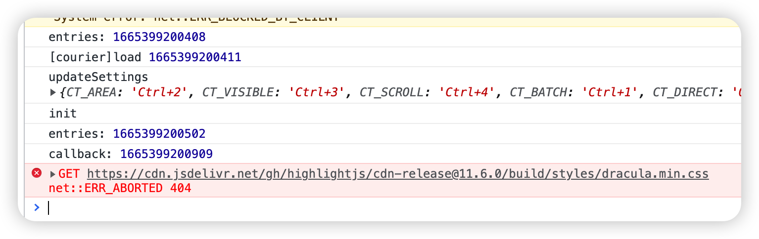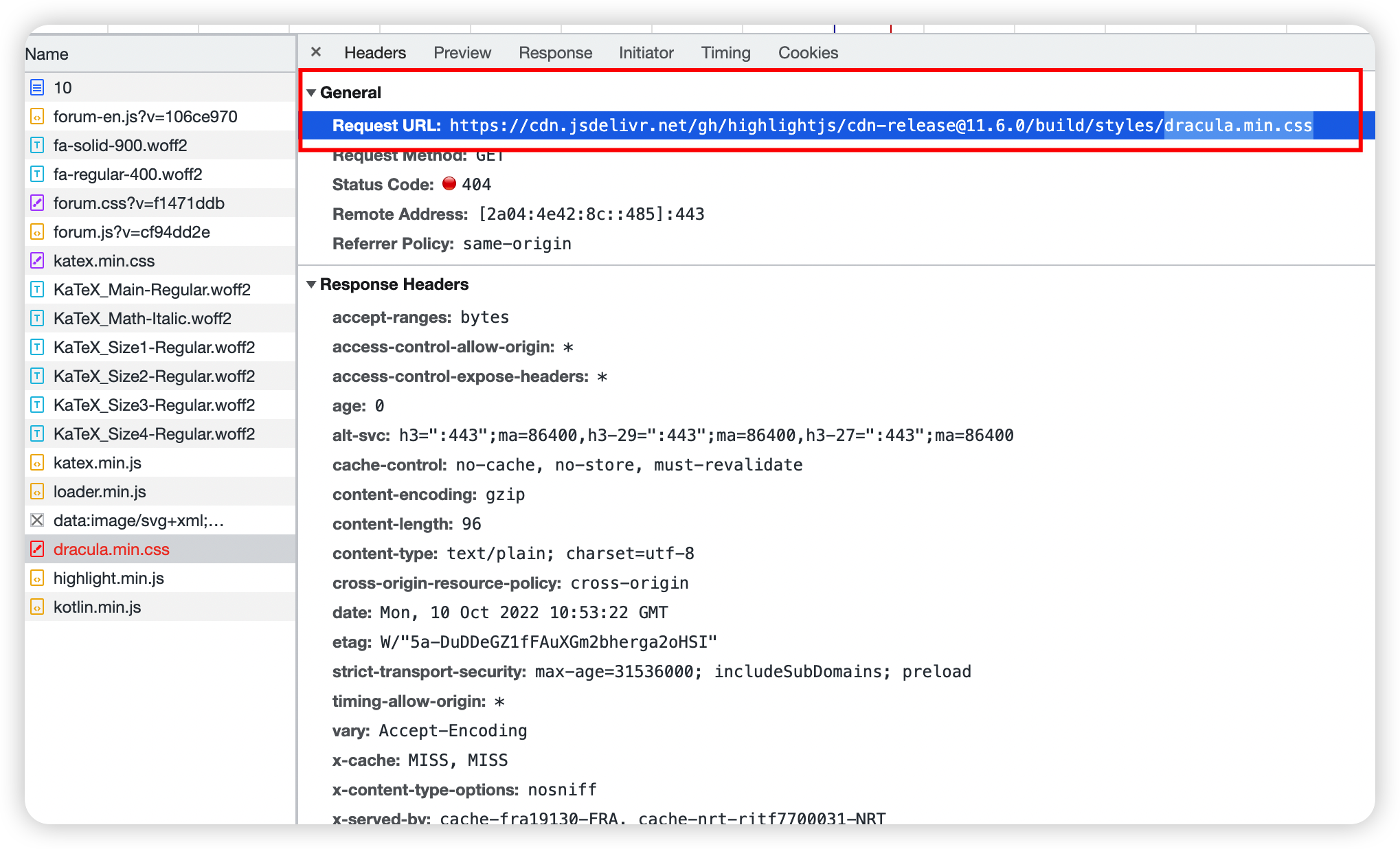 这里刚开始我就是按照dracula配置的,但是这个代码主题并没有生效,打开控制台发现原因是没有正确加载dracula.min.css这个文件