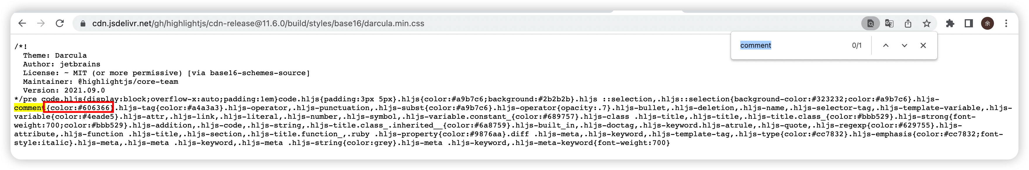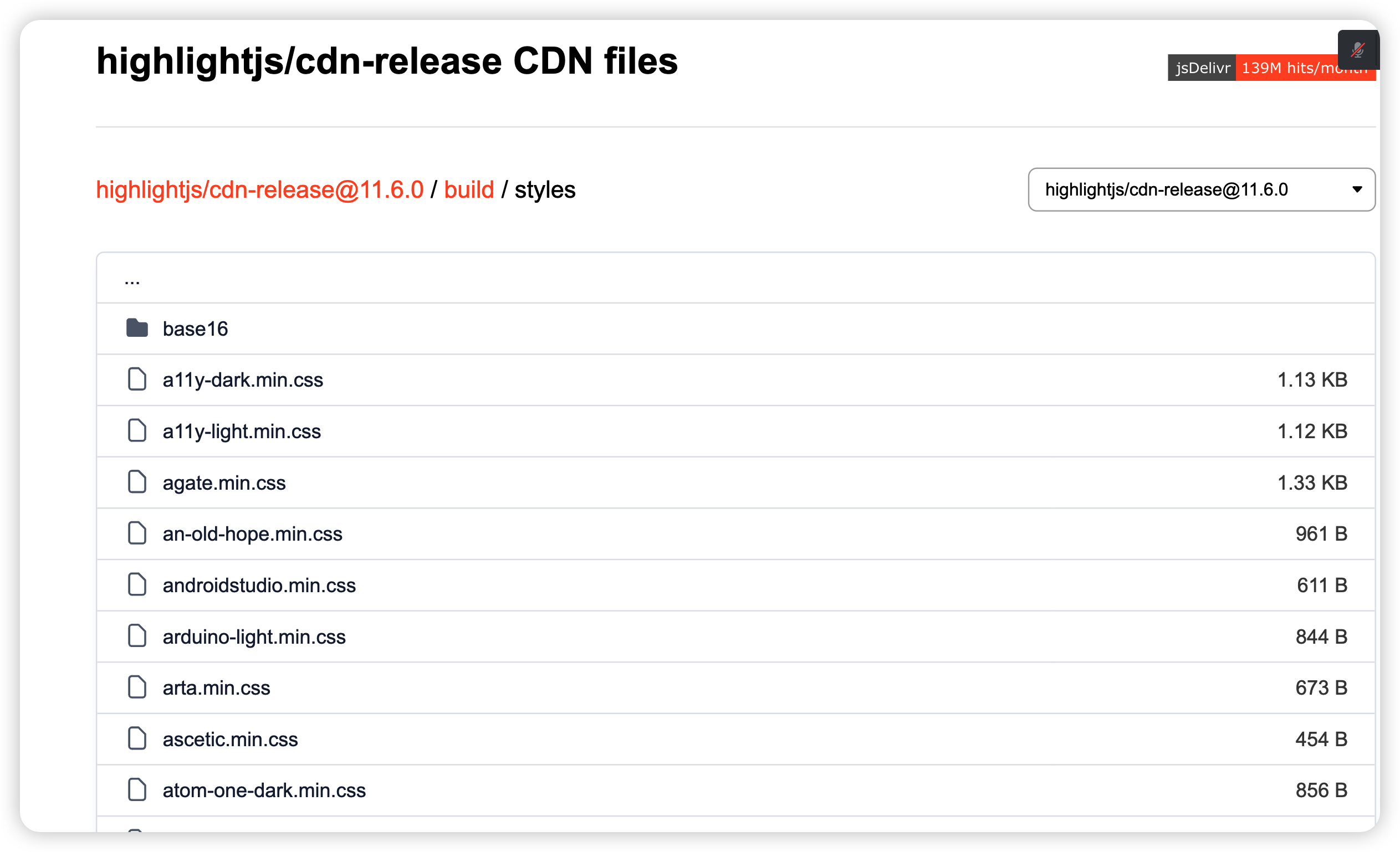 我们删掉链接末尾的dracula.min.css直接访问https://cdn.jsdelivr.net/gh/highlightjs/cdn-release@11.6.0/build/styles