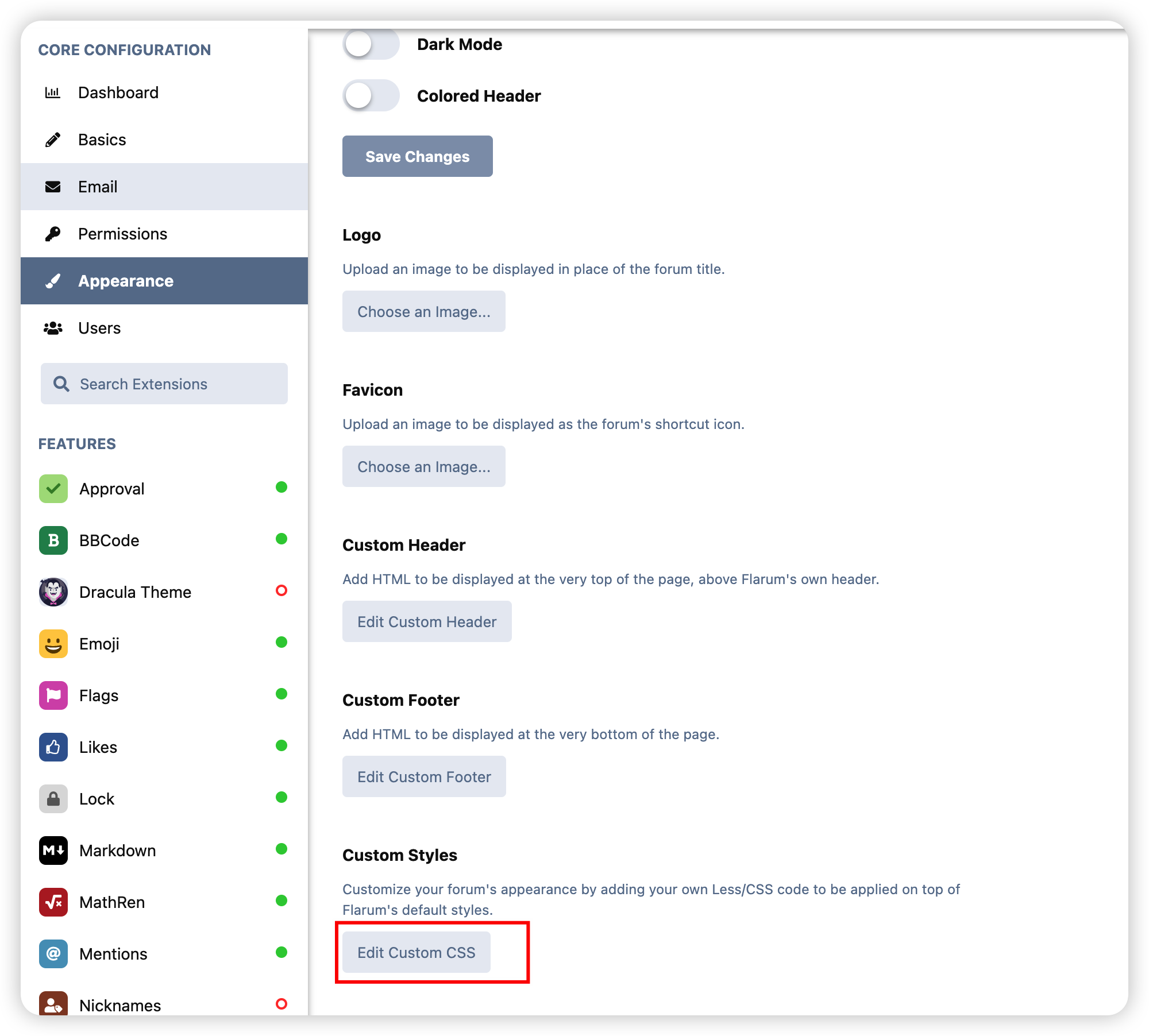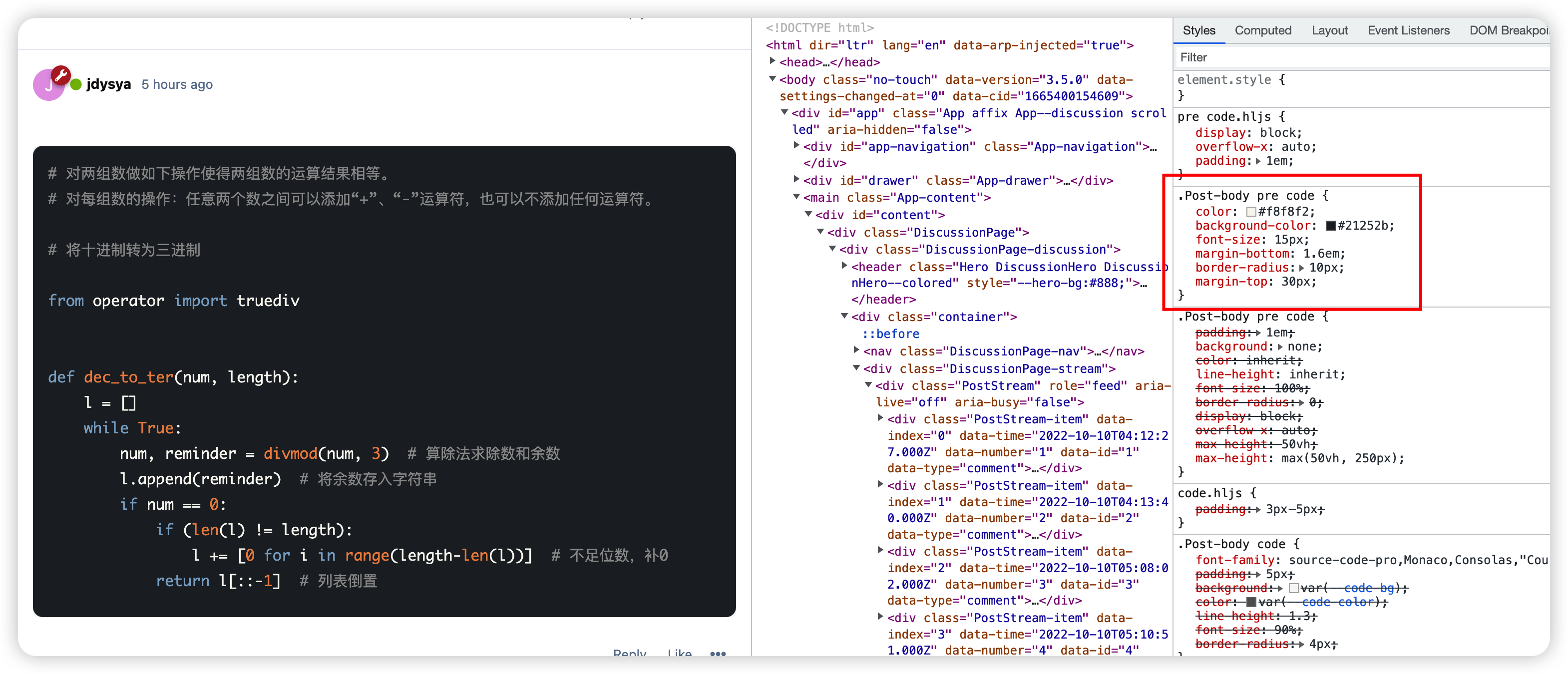 引入其他代码主题后,代码块样式还是达不到预期,我们还需要自己定义一些样式参考flarum-discuss: Change “code” background,这里的其实有点问题,不知道是不是版本的问题,反正在flarum v1.5.0中对应的代码块的css样式为.Post-body pre code