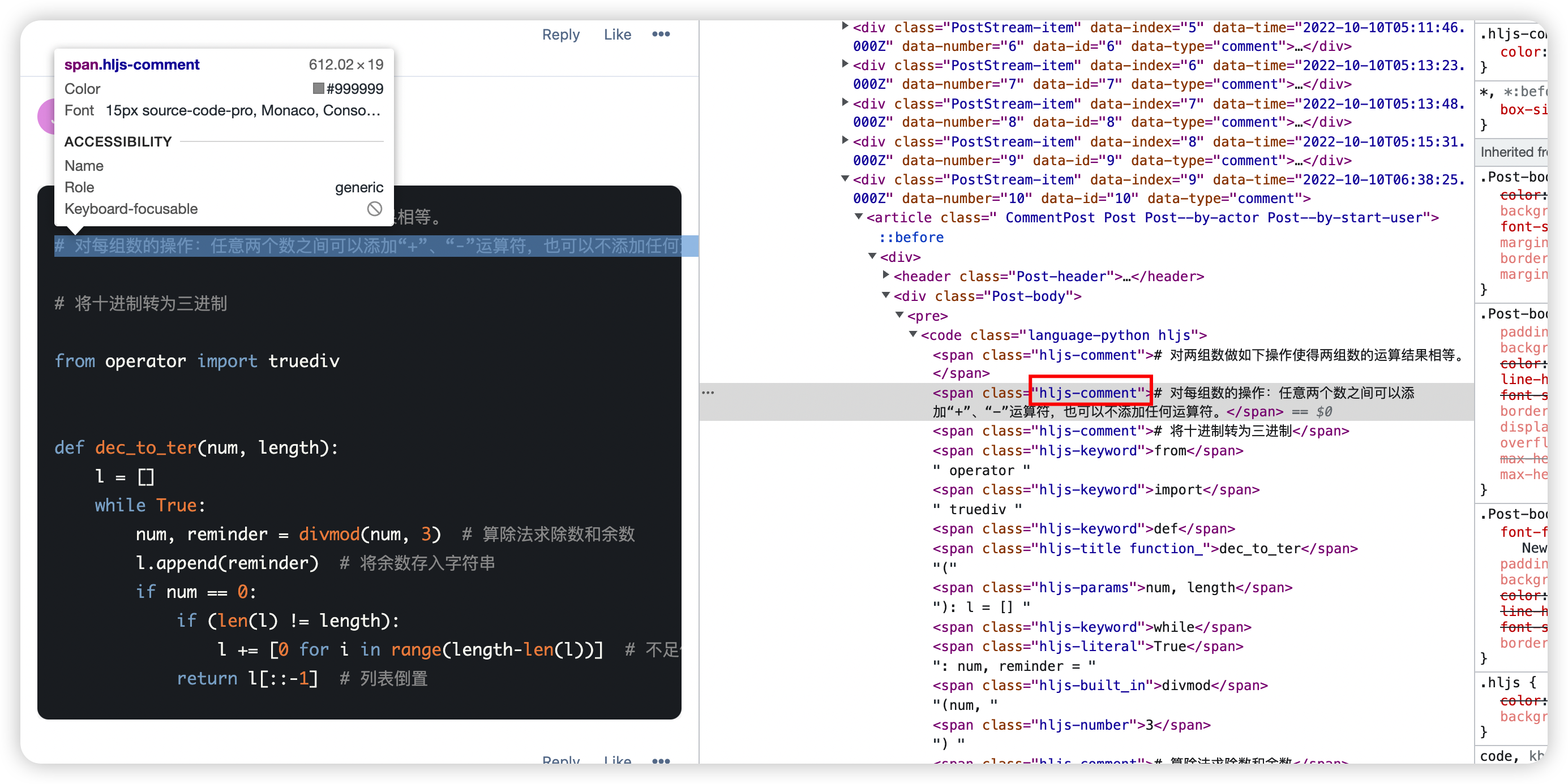 查看网页上代码块对应的html,可以发现对应的代码块中的代码是已经被解析了的(hightlight.js的作用),例如这个注释,所对应的css样式为hljs-comment,